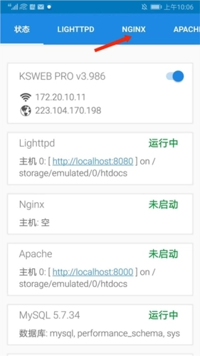 1、启动KSWEB应用,进入其主界面后,能看到状态、LIGHTTPD、NGINX、APACHE、MYSQL、PHP、FTP等多个分栏,用户可依据自身需求选择使用,此处我们以【NGINX】为例进行说明,