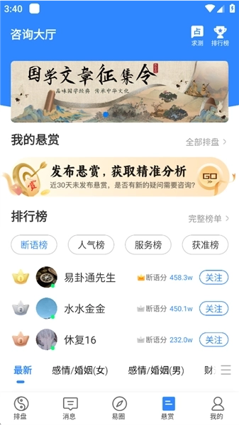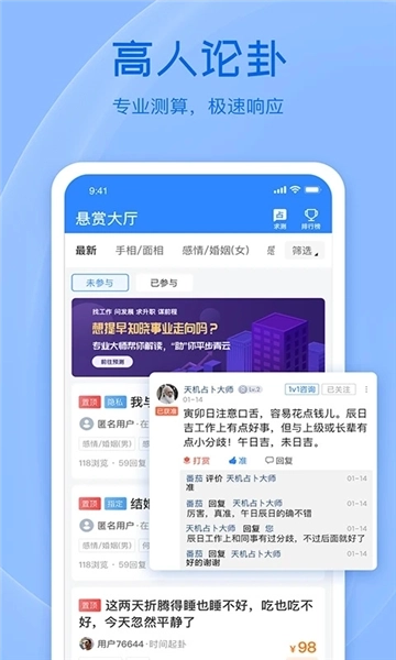 3、待通过咨询师认证考试,成为合格的六爻咨询师后,可在天机六爻的悬赏板块为用户提供测算服务,积极参与断卦,符合打赏规则的,将获得相应赏金。