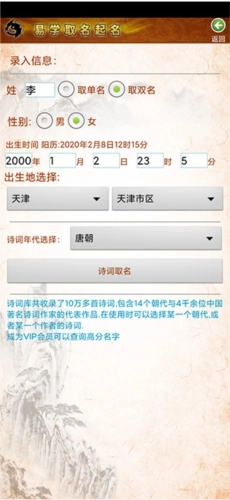 3.富有文化底蕴与时代气息:系统生成的名字取材于各类古籍、诗词、成语、名人名言以及名人用字。