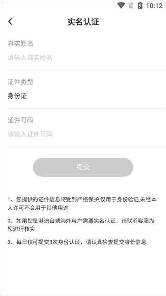3、最近就能进入实名认证页面了,这一步需要填写你的“真实姓名”和“身份证号码”。不过要注意,“得劲就会死”这款软件每天只能提交3次身份认证申请,所以在进行认证时,一定要仔细核对所提交的身份信息,避免因信息错误导致认证失败,浪费提交次数。