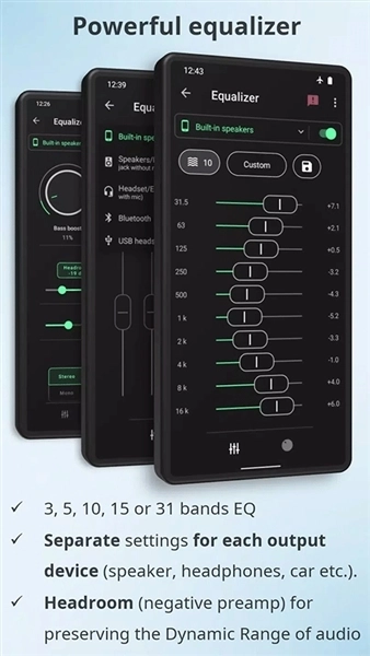 9、出色的均衡调节功能:可针对扬声器、耳机、蓝牙设备等分别进行预设配置与参数调整。
