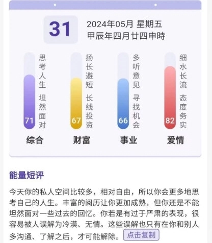 5、深度能量解读:能量详情与短评,助您深入了解每日运势,从容应对。