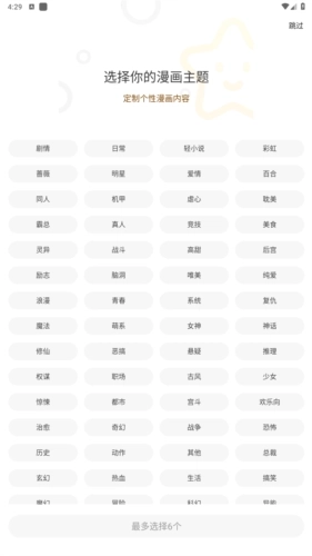 2、挑选你钟爱的漫画主题,后续平台会重点推送与之相关的漫画内容。