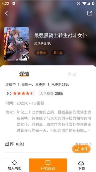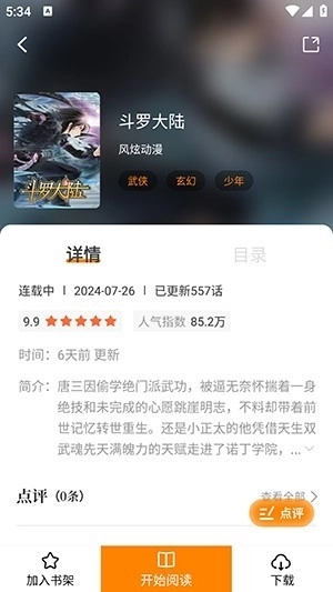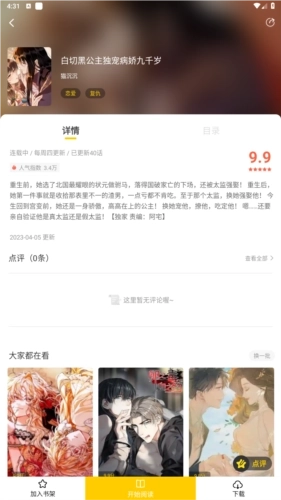 8、在漫画的详情页面,设有加入书架、开始阅读等功能。