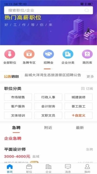 盐城人才网招聘网,是专为盐城地区量身定制的找工作神器。这款专业的一站式招聘平台,不仅提供移动求职、在线沟通和技能培训,还利用大数据进行精准推送,确保全方位的人力资源服务。所有岗位均经过严格审核,您可以安心投递简历,迅速找到心仪工作。让您的求职之路更加便捷!盐城人才网招聘网,打造属于您的个性化求职体验。