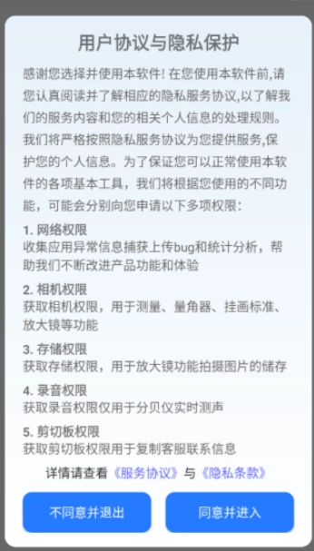1、用户需在线阅读用户协议与隐私保护相关内容,同时开启各类权限,点击同意后即可进入。