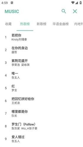 2、音乐中会看到很多歌手和热歌榜,将你喜欢的音乐收藏到本地,就能随时随地听歌了。