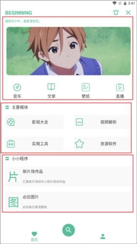 1、打开,你会发现【首页】包含三个模块,主要模块、小小程序以及音乐等。