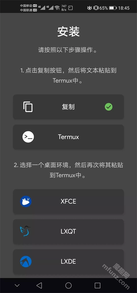 一键安装系统:把命令复制到Termux里,就能自动完成Linux系统的安装与配置。