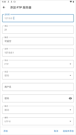 接着把主机名设置为127.0.0.1(这一步很关键,它代表服务器自身,如此一来传输数据时会直接通过本机网络,速度会非常快)、端口(就是刚才设定好的那个)、路径(这里指的是之前设置的根目录的相对路径,这个选项可以不填写)、名称(可以随意设置一个,它会显示在列表当中,要是不设置的话就默认显示为127.0.0.1)、协议(保持默认的FTP即可)、验证(选择默认的密码验证方式)、密码、模式(默认的被动模式就行)、编码格式(默认采用UTF-8)。全部设置好之后进行保存,此时列表里就会出现刚才设置的名称。配置完成后启动服务,就能使用ftp文件服务功能了。