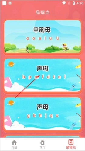 1、打开小学生学拼音应用,里面设有介绍、学习和易错点三个版块,其中介绍版块主要是对汉语拼音学习进行相关说明。