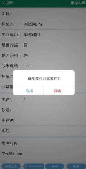 1、打开App后,找到包含附件的发文并点击进入,接着点击附件【工作薄1.xlsx】,此时界面会弹出文件打开确认框,点击【确认】按钮即可。