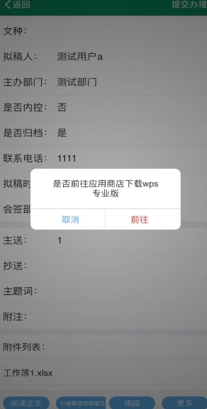 2、系统会自动检测本机是否安装了专业版WPS,若已安装则直接跳转至WPS进行文件预览;若未安装,将弹出新的确认框,点击该页面的【确定】按钮后,会跳转至内部应用商店。