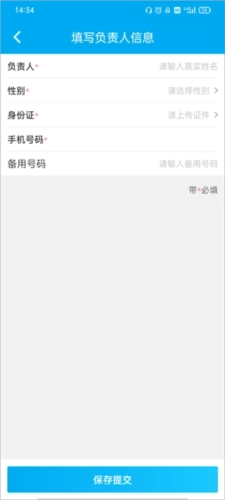 2、第一步是填写负责人信息,需将身份证上的所有信息准确填入输入框,之后点击保存并提交。