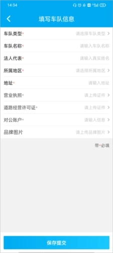 3、第二步为添加车队信息,需选择车队类型、确定法人代表,并上传营业执照,完成后点击保存提交;之后继续填写车辆信息,依照提示进行填写与上传操作即可。