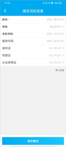 4、最后一步是输入司机信息,司机需重点上传驾驶证与从业资格证,其余信息的填写要求与前述一致。待所有信息填写完毕后,保存提交即可,系统审核通过后就能使用相关功能了。