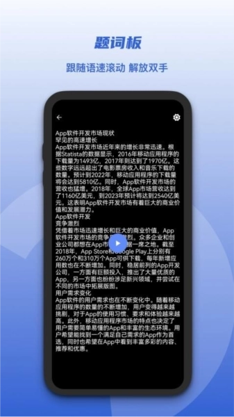 口播提词器是您的直播和视频制作得力助手,让精彩口播无须反复记忆。这款创新的应用允许您在直播中开启提词模式,将提词内容无缝融入手机屏幕,让您在镜头前自信地呈现每一段广告词。从此告别复杂台词,尽享流畅表达的便捷。其智能悬浮功能,可适应各大直播平台,满足多样化需求,让提词变得轻松自如。此外,您还能自由定制字体大小、颜色、滚动速度等细节,为您打造个性化的提词体验。立即口播提词器软件,体验前所未有的提词新境界!