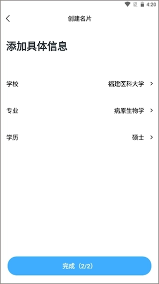 3、这时候要选择具体的信息了,因为我选择的是医学生身份,所以需要选定所在学校、专业以及学历,这些信息都选好后,点击完成按钮就可以了。