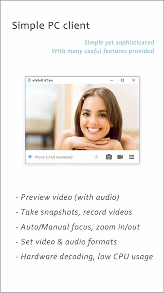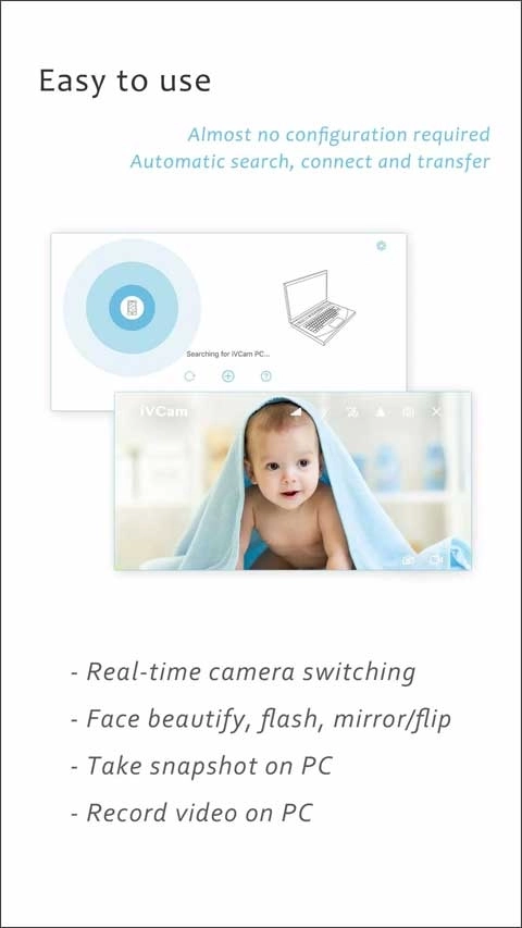 ivcam手机客户端是一款相当实用的视频监控软件,能把你的手机摄像头转化为适配电脑的高清网络摄像头,在画质、色准以及对焦速度等方面,完全不输给市面上大多数网络摄像头。借助它,你可以用手机实现监控功能,比如看护宝宝或者照看宠物,从而更有效地保障居家安全。不仅如此,该软件还支持将手机拍摄的视频直接录制到电脑里,感兴趣的用户可别错过,赶紧来体验一下吧!