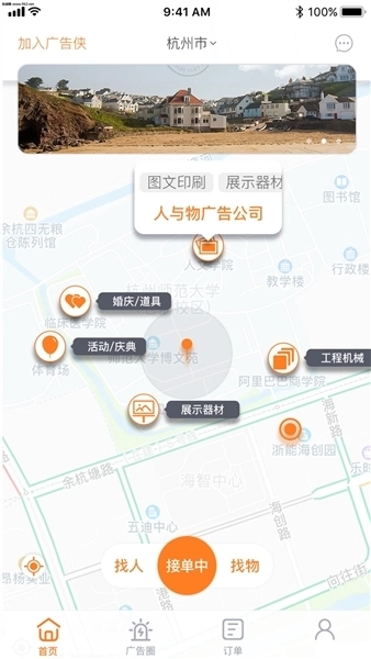 可以根据你的定位智能的搜索附近的广告订单和物料,方便