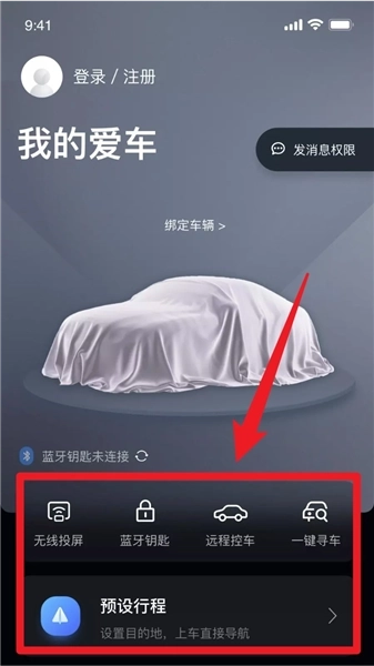 3、登录后在首页点击“绑定车辆”完成车辆关联,之后就能使用蓝牙钥匙、远程控车、导航找车等各项核心功能了。