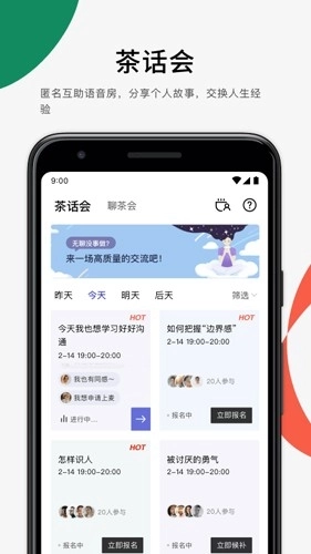 月食茶话会是一个匿名互助语音房,这里不仅提供多元的话题选择,还有语音聊天、围观上麦等丰富玩法。在主理人的引导下,参与者能够在公平、尊重且包容的交流环境里,分享个人故事,解答内心困惑,交换人生经验,从而收获真诚且宝贵的情感联结。