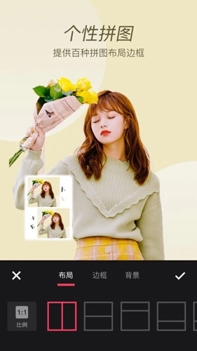 3、拼图功能:支持多张照片的编辑拼接;模糊功能:能够一键实现背景模糊效果,同时还具备自动识别脸部的整形功能,如放大眼睛、调整微笑弧度、瘦脸等。