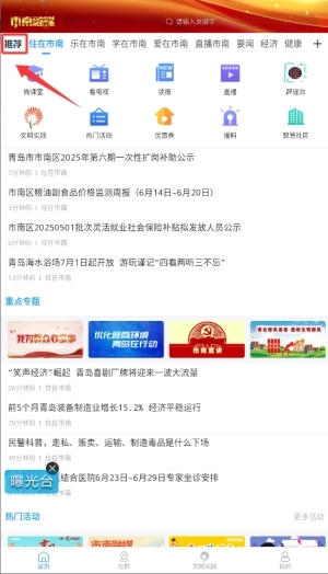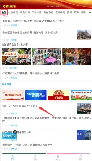 1、进入市南融媒后,在首页点击“推荐”版块,就能浏览精选的本地新闻和热点资讯。