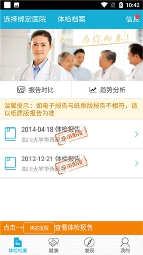 用户登录后,既能查看在华西的历年体检报告,也能获取最新的体检报告,无需再亲自到医院领取,彻底告别相关烦恼。