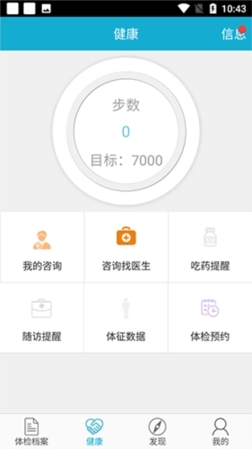 2、点击“健康”选项,即可查看当日行走步数,还能设置吃药提醒以及咨询医生。