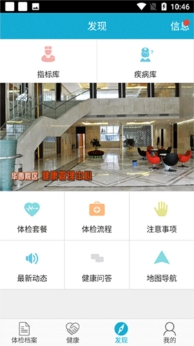 3、点击发现,即可查看相关医院的体检套餐、流程以及注意事项。