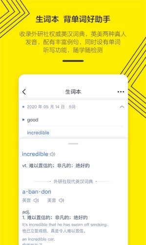 外研社权威英汉词典配备英美真人发音,辅以丰富例句,从音、形、义多维度助力学生记单词、学用法,还设有选定单词的听写功能。