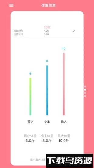 2. 体重管理:能够记录体重的变化情况,生成折线图或者柱状图,还可以和标准体重进行对比,并且支持一键分享相关数据;