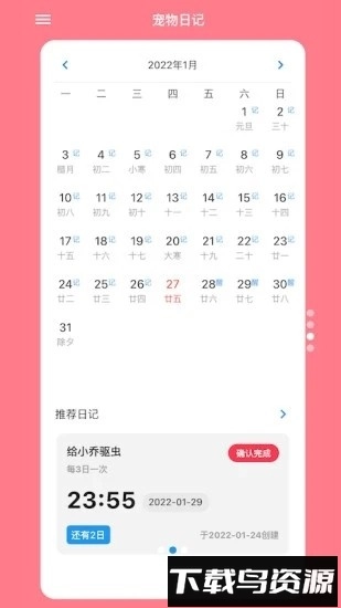 4. 日常记录:采用日记的方式记录宠物生活中的点点滴滴,能够设置事项提醒功能,还可以按照日历视图来查阅历史记录;