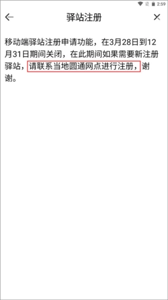 2、此时页面会提示注册申请功能已暂停,你可前往当地的圆通网点办理注册。