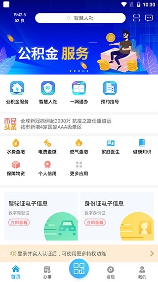 1、,打开软件进入首界面后,用户可在此查看公积金、缴纳水电费以及进行医院预约挂号。