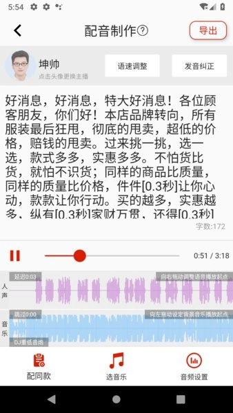 1.智能导出:所有生成的配音内容可直接保存至U盘或本地设备,且支持循环播放功能。