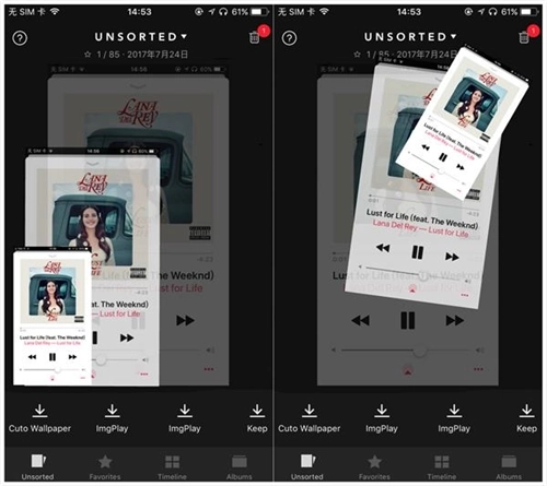 3、完成初始设置后,就可以着手整理相册了。相册整理的操作方式很简单,主要有这几种:向上滑动可以删除图片,点击下方的相册能把当前图片归类到对应的相册里,左上角的按钮可以撤销上一步操作(iOS版本还额外提供了收藏和长按分享的功能,不过如果只是用Slidebox来整理图片的话,这些功能可能用不上,有需要的用户可以自行使用)。之后,通过简单的滑动和点按操作,就能把所有图片分类好。分类完成后打开手机的系统相册,会发现所有图片已经按照你设置的分类归置妥当。
