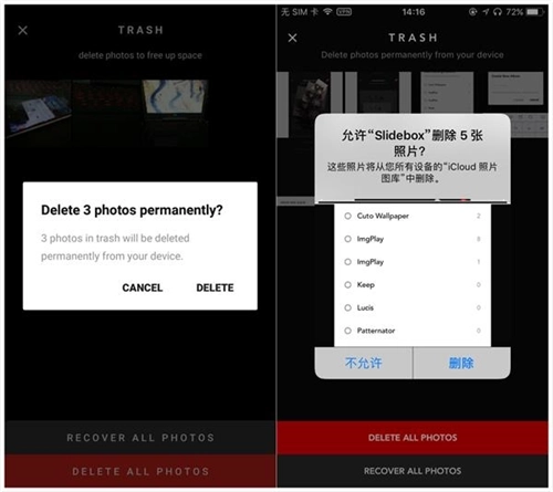 4、需要说明的是,在Slidebox里被拖入垃圾箱的图片并非直接被删除,你可以点击垃圾箱进入回收站查看或恢复这些图片,当然,也能将它们彻底删除。