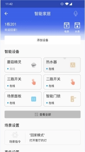 5、进入智能家居页面后,能够添加设备与场景,借助手机对智能家居电器进行控制。