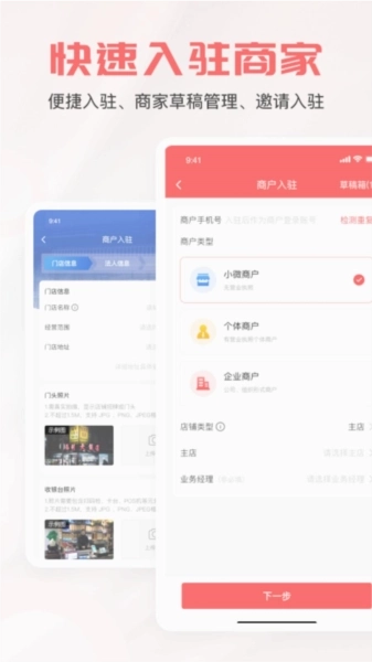 2,快速商家入驻:商家可便捷完成入驻操作,系统支持商家对入驻草稿进行管理,同时支持通过邀请方式助力商家入驻。