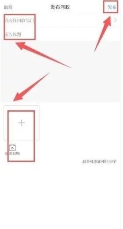 3、点击发布按钮,进入发布问政的页面后,选择对应的问政部门,输入问政标题和具体内容,还可以添加相关的图片或视频,最后点击【发布】即可。