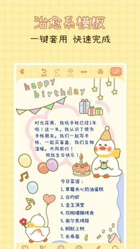 1、爱鸭手帐是一款治愈系的可爱软件,有超萌的手帐鸭陪伴你记录手帐日常。你能在温馨的氛围里,自由地进行拼贴创作和生活记录。