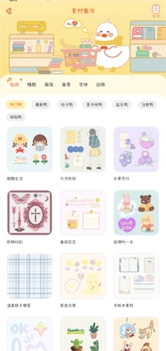 3、素材广场的素材品类齐全、样式丰富,原创新颖的手帐贴纸、背景、画笔还在持续更新中。