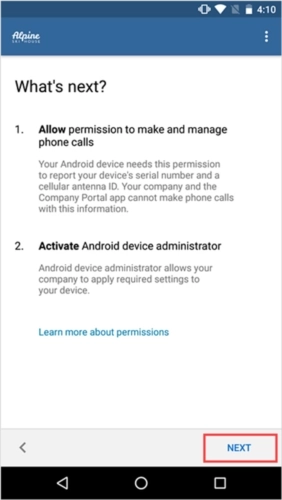 允许公司门户拨打和管理电话:此权限允许设备与组织的设备管理提供商Intune共享其国际移动工作站设备标识(IMEI)号码。允许此权限是安全的。Microsoft永远不会拨打或管理电话。