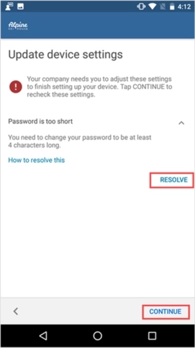 8、组织或许会要求你更新设备设置。点击“解决”来调整相关设置。等设置更新完成后,再点击“继续”。
