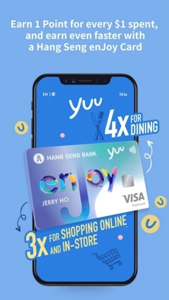 3、使用恒生enJoy卡进行签账,能帮您更快速地积累更多积分:在任何商户消费每满1港元,即可获得1个yuu积分;若在yuu零售合作伙伴处消费,可享受3倍积分;而在餐饮合作伙伴处消费,则能获取4倍积分。