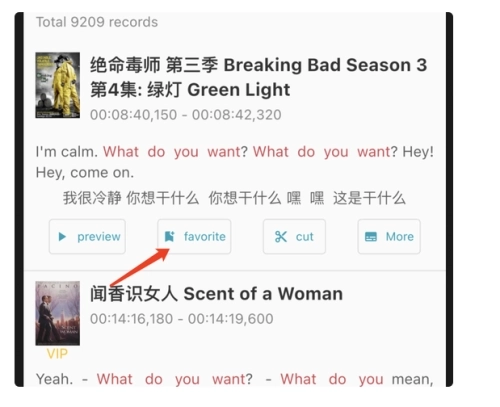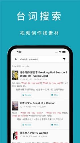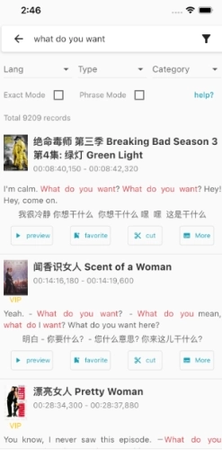 3、能够自动呈现影视中对应字幕的片段,方便用户通过观看视频来学习对话;