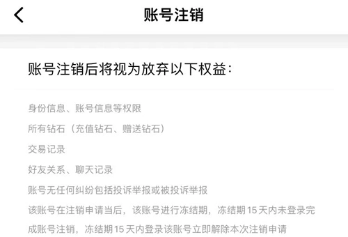 该账号在注销申请当后,该账号进行冻结期,冻结期15天内未登录完成账号注销,冻结期15天内登录该账号立即解除本次注销申请