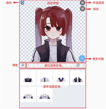 左右滑动部件选择区域,或是点击上方“部位选择区域”里的小图标来切换部位,这样就能替换其他部位的部件了。